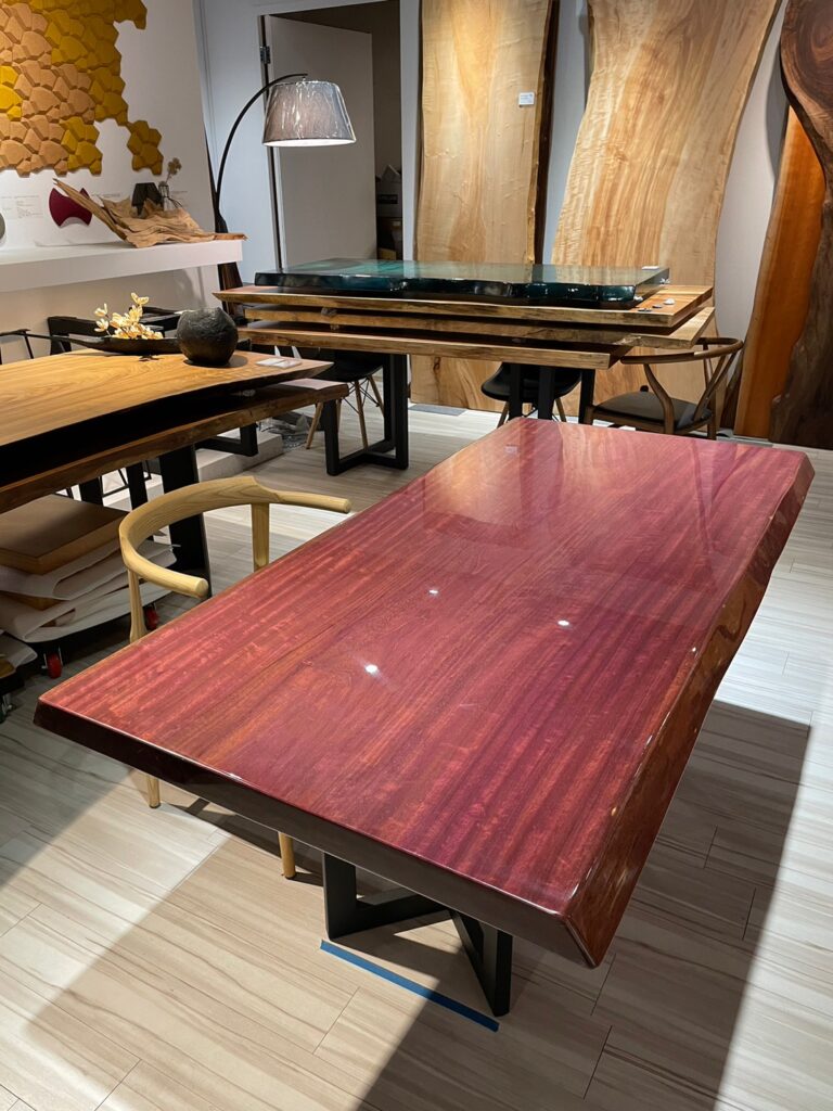 用途推薦: 適合4~8人餐桌、書桌、茶几、長凳、電視櫃…等。 木種特色: 紫心木剛切下時會呈現成紫色,經過陽光照射後氧化會慢慢變成棕色,木材本身非常堅硬,防水性能很出色,對於白蟻也有一定的抗性。